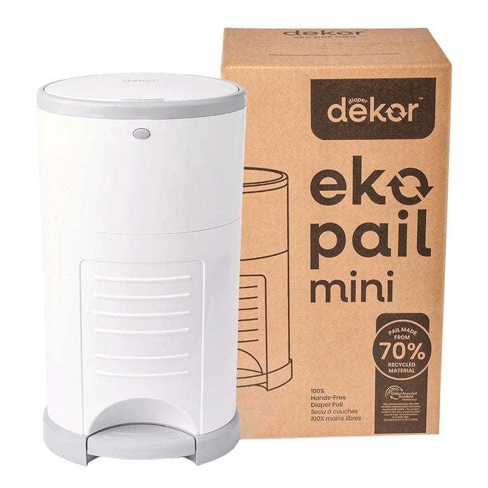 The same hands-free convenience parents swear by—now redesigned with the planet in mind. The Dekor Eko Diaper Pail features our signature 100% hands-free step-and-drop system and is now crafted using 70% GRS Certified Post-Consumer Recycled Plastic, helping you care for your baby and the Earth.
