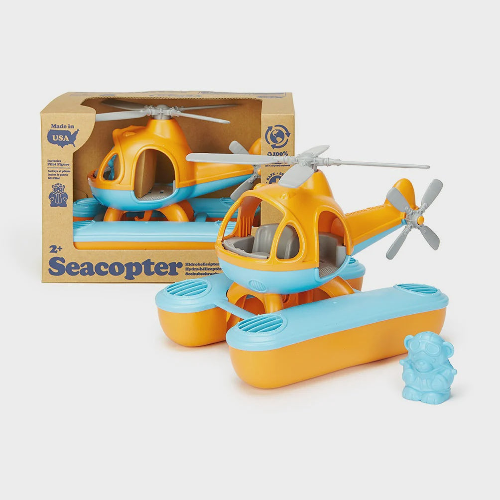 Water landings have the green light the Green Toys Seacopter is ready to accept any eco-friendly rescue mission! Specially designed with stabilizing, oversized fill-and-spill pontoons to keep it steadily afloat, this amphibious flier is perfect for water play whether in the bath or at the beach. Featuring a large top rotor and additional tail rotor, the Seacopter also includes a pilot bear figure for the open-design cockpit.