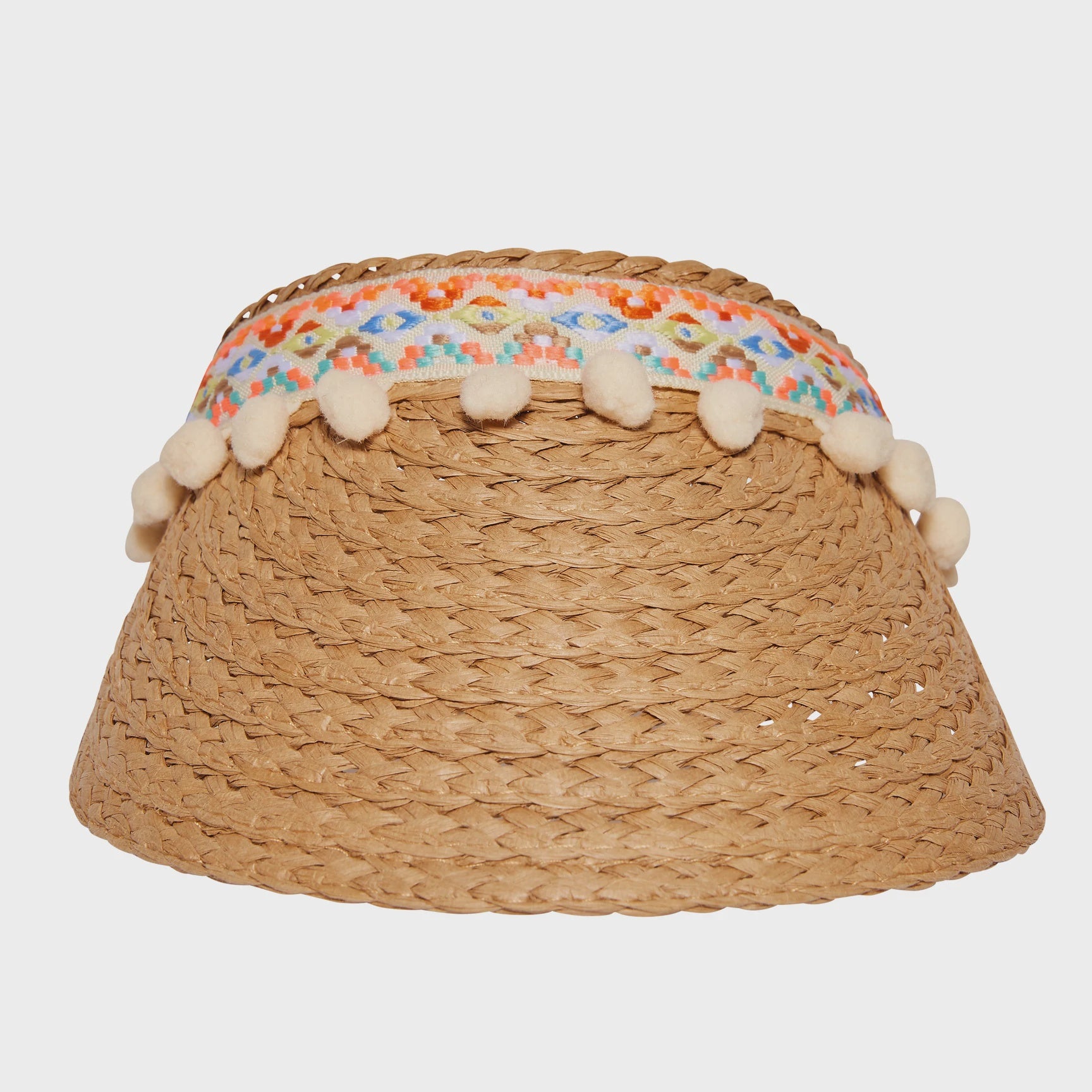 Straw visor from Headster adorned with trim and pompoms. This visor has an adjustable velcro closure.