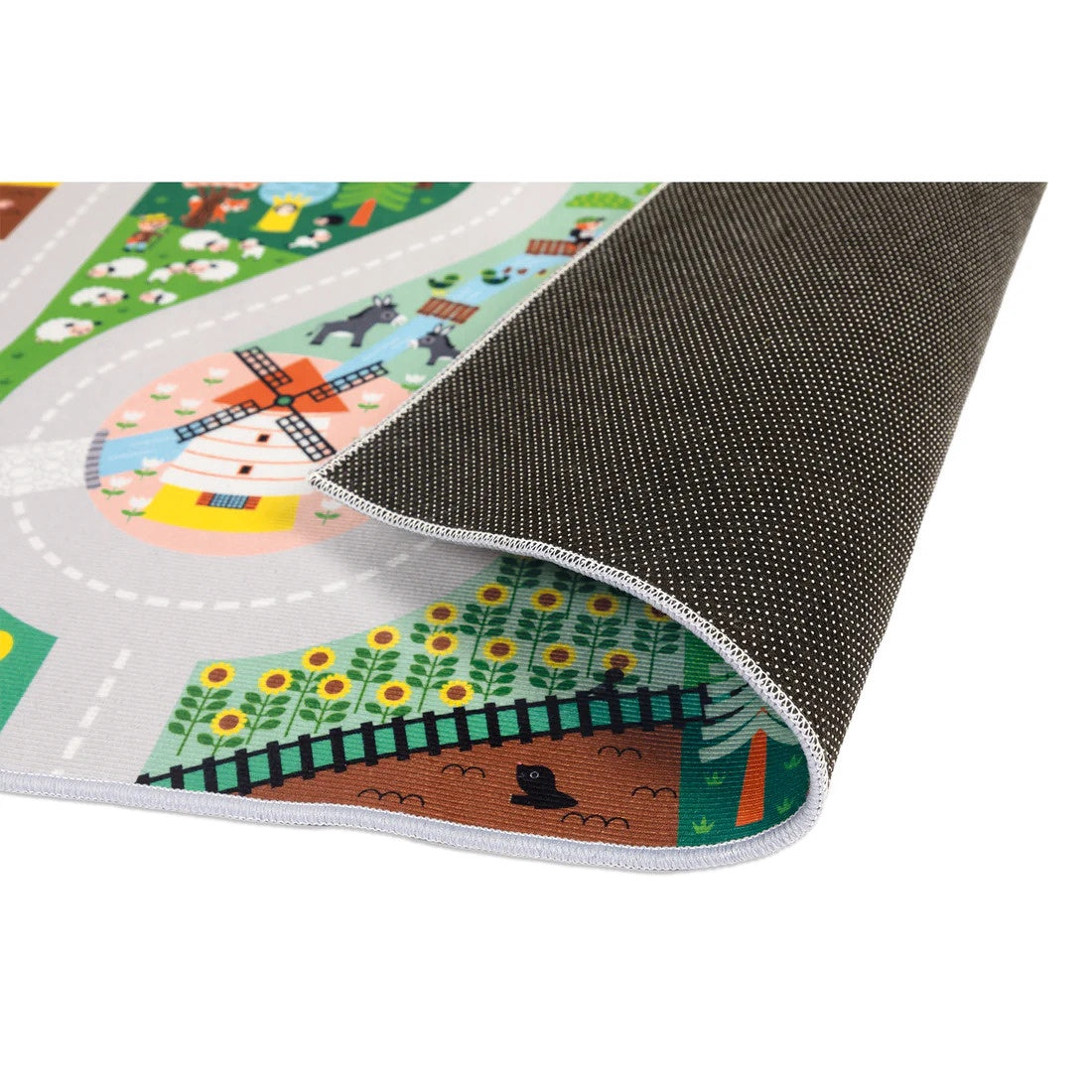 Ah, the countryside! In this bucolic, pastoral setting, we pass from the farm to the forest, and even through the equestrian center! This countryside playmat is suitable for children aged 2 and over. It has a wide, long road, so you can take the key to the fields and imagine endless stories! On their play mat with circuit, little ones enjoy winding country roads in search of hidden elements, like a search and find game. They'll spot the wolf in the forest, the farmer in his tractor, and be amused by the little ducks crossing the river... There are so many buildings, animals and characters represented! We start by watering the vegetable garden, then head off to help the shepherd look after his sheep, before heading off to the riding school for a horse ride. With their fabric play mat, children develop their imagination and vocabulary, as well as their sense of observation. Little ones can even discover colors and numbers from 1 to 10! Another plus for this children's play mat: it's non-slip! Perfect for rolling toy cars on, or simply for little ones who like to keep moving. In its 120 x 78 cm format, this children's room mat offers further play possibilities with its accessories (sold separately): it can be completed with a range of vehicles and wooden blocks, also from our Cross Roads range. You can also link this farm mat with other mats in the collection, to create a giant play area and extend children's adventures. In fact, the circuits are designed to link up on all 4 sides of the mat. How about pitching the tent tonight?