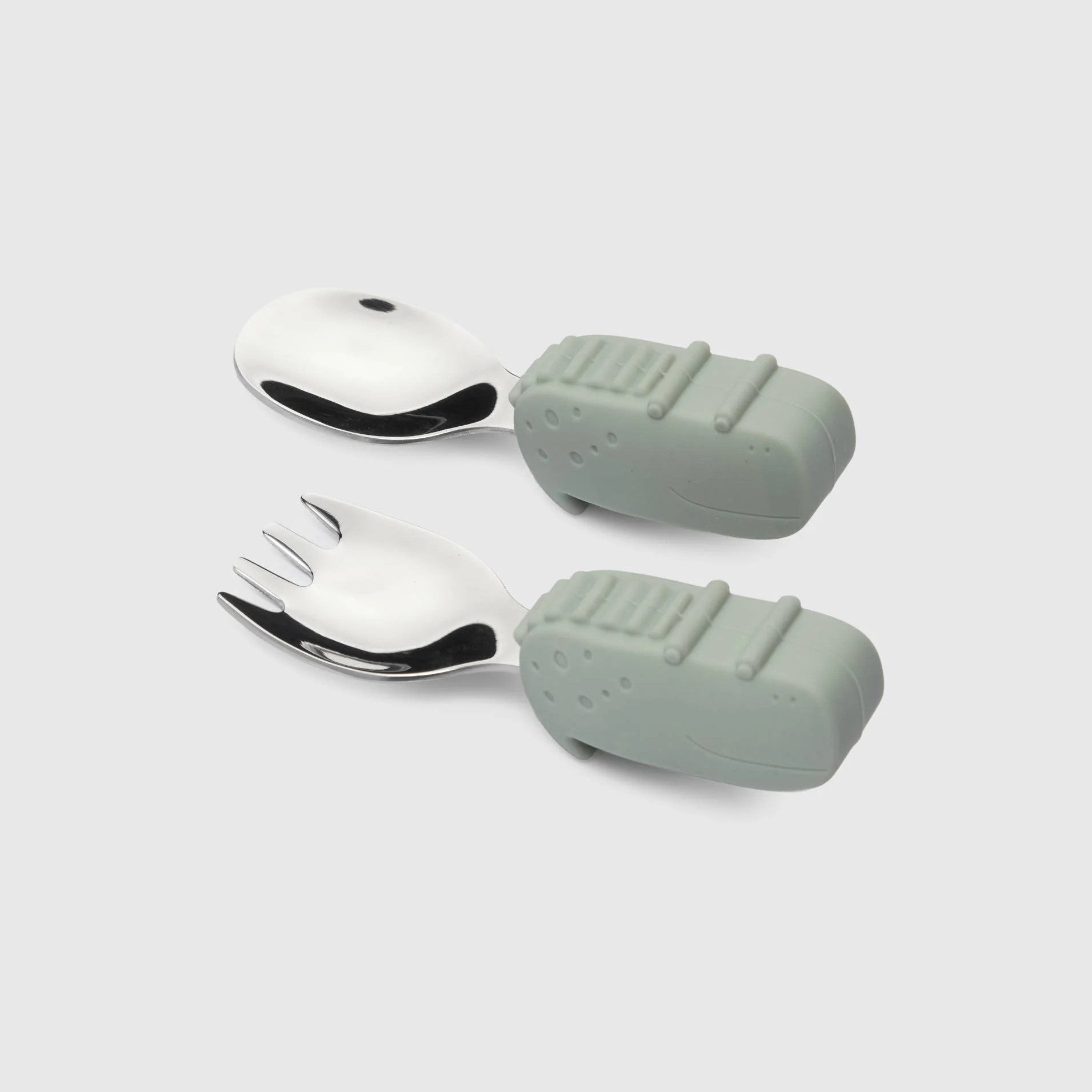 Our toddler spoon and fork set is made for self-feeding, with chunky, easy-grab handles that help little hands learn to scoop, stab, and snack all on their own (so less food ends up on the floor!). Crafted from buttery-soft, food-grade silicone and durable stainless steel, and topped with our adorable animal characters, they're the perfect mix of safe, functional, and fun.