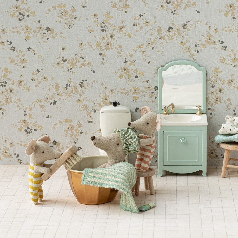 Like everyone else, this mouse loves to spend hours in the warm water in her lovely bathtub. This playset contains a golden metal bathtub, a big sister mouse, a showercap and a towel.