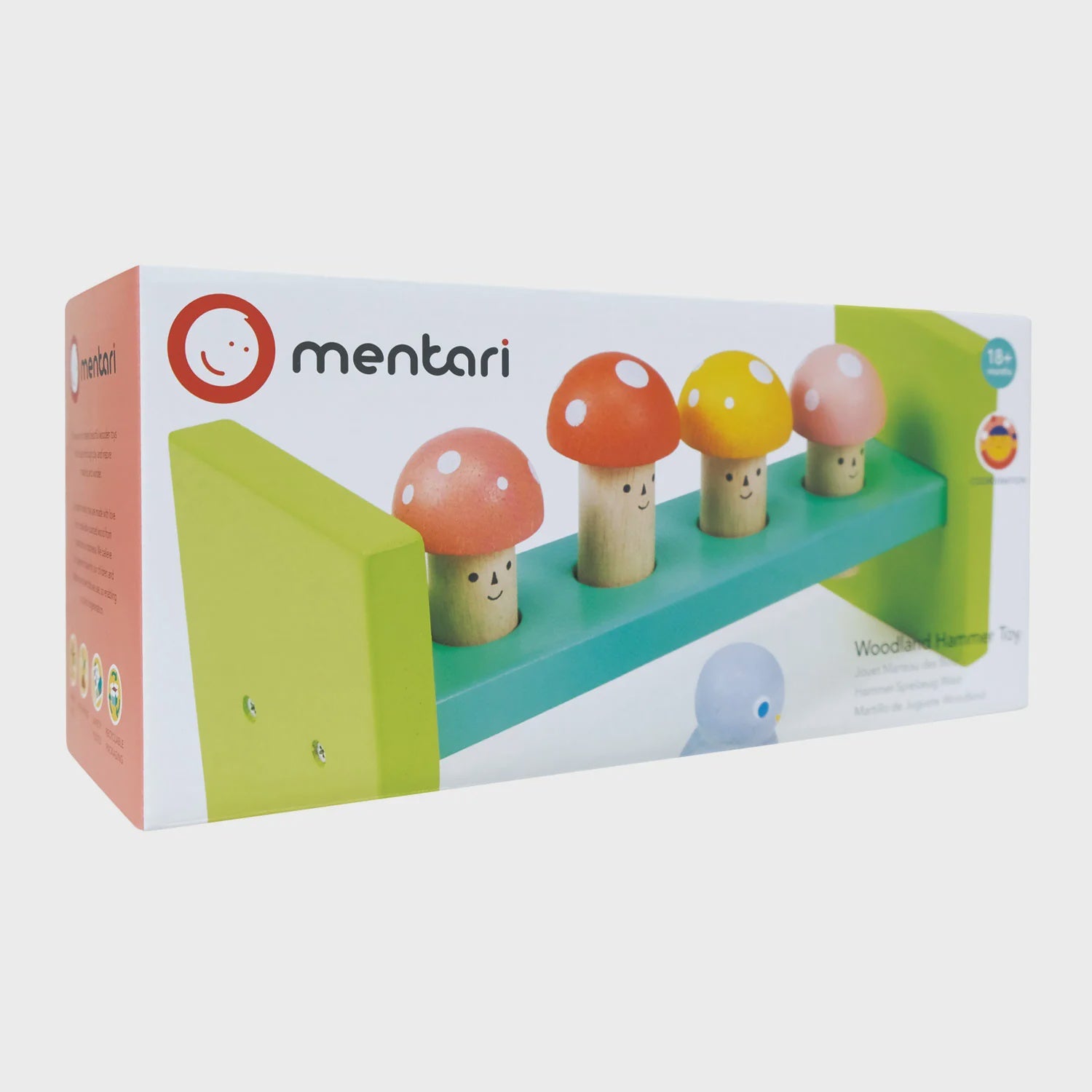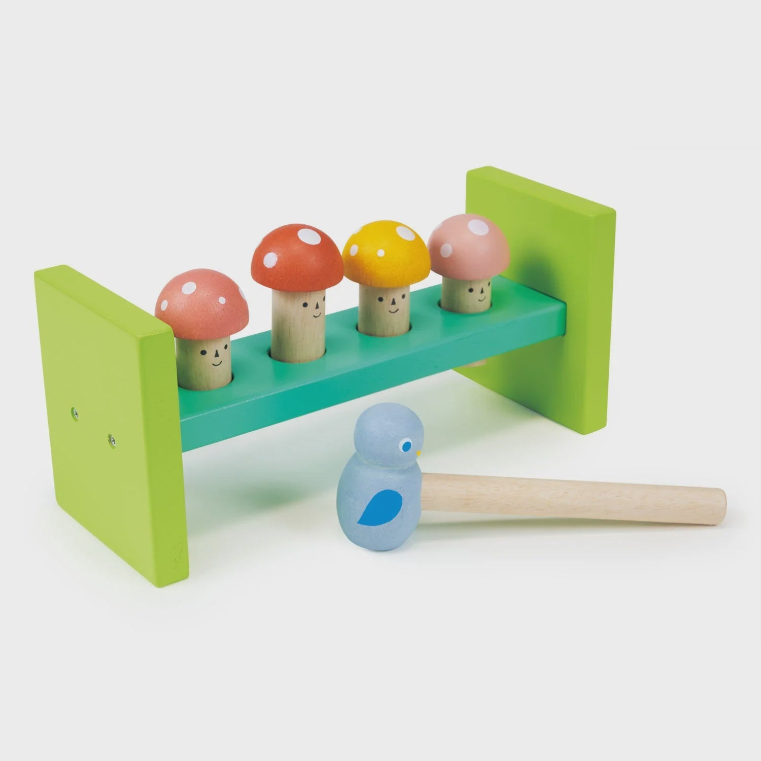 This woodland-themed wooden hammer game features a tray with four smiley-faced toadstools. Use the charming bluebird-shaped hammer to tap the toadstools down, providing hours of fun.
