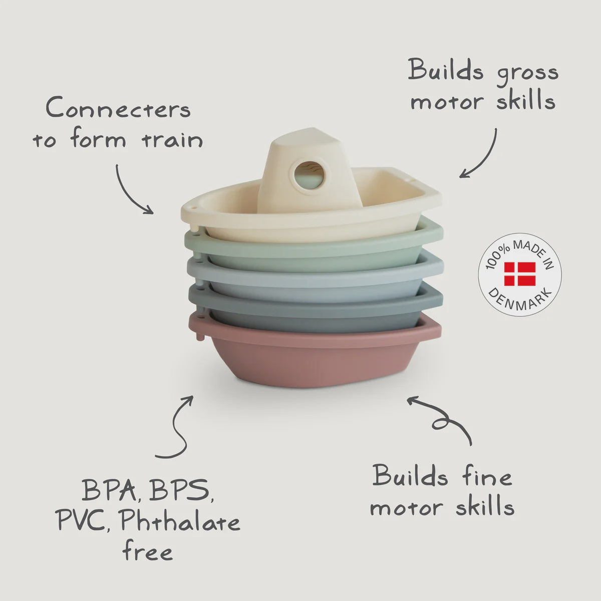 Set sail with Mushie's stackable bath boats that encourage independent play for children of all ages. Packaged as a set of five, these plastic boats link together to create a floating train of toys. Made in Denmark, these nautical classics will inspire the imaginations of even the littlest sailors.