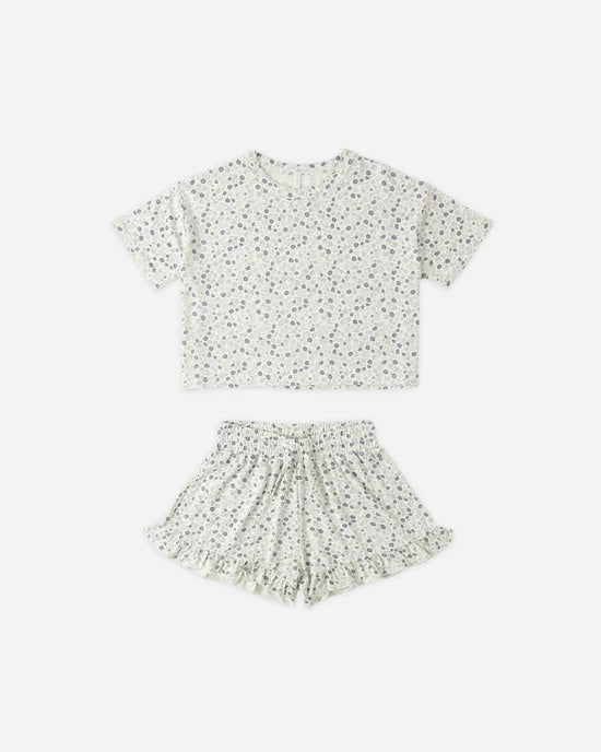 Lounge away your summer days in this cozy set - a drop shoulder top and matching shorts with ruffle detail at the hem. Featuring ‘blue ditsy’ print on 'ivory' hue.