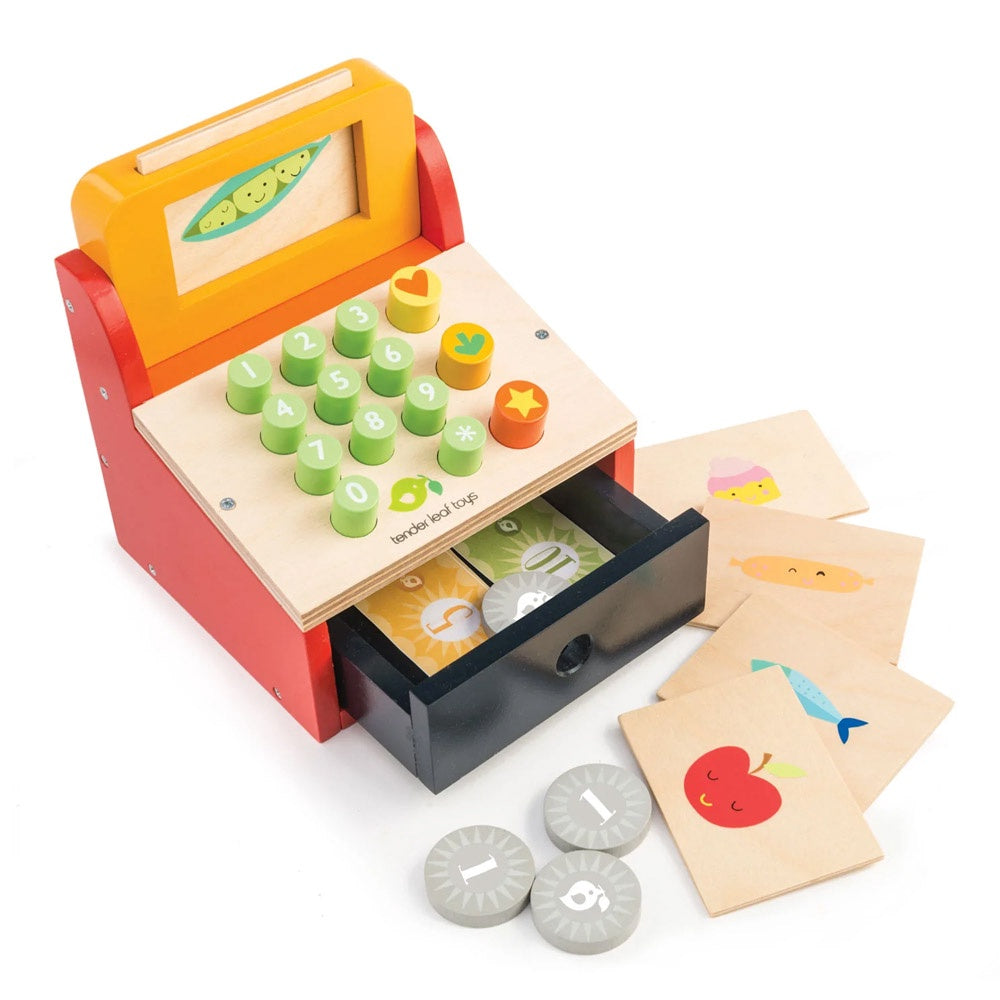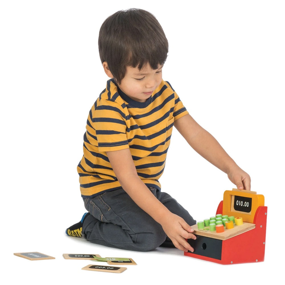 This beautifully painted till has real buttons to push and is packed with paper money and wooden coins. There are 5 wooden pictures to slot into the top window for extra play. Watch your children develop number bonds and social skills with this till! This toy can aid hand eye coordination and promote imaginative and creative play.