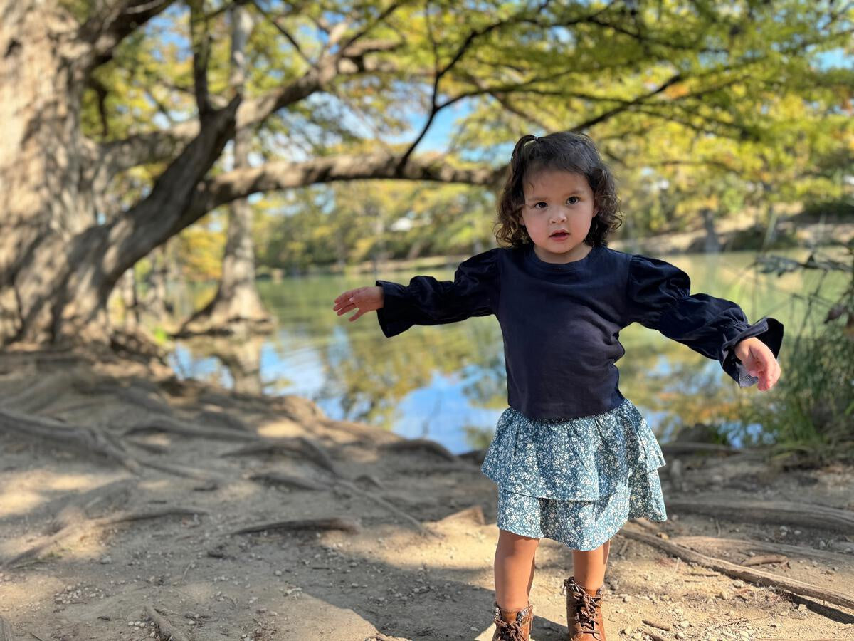 Introducing the Aoife Skort in Evermore'”a playful tiered skirt with built-in shorts for endless twirling! Featuring a charming floral print, this skort is a delightful choice for any adventure. Get ready to spin in style!